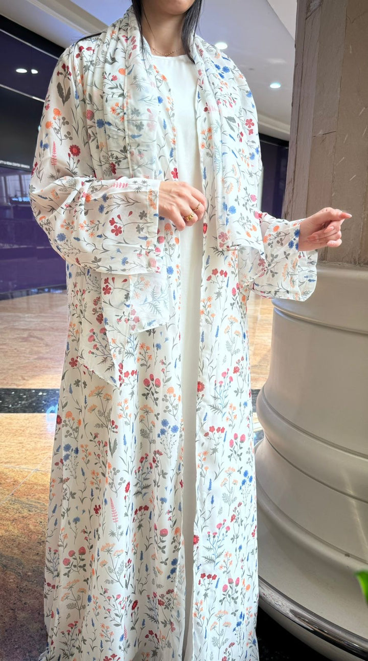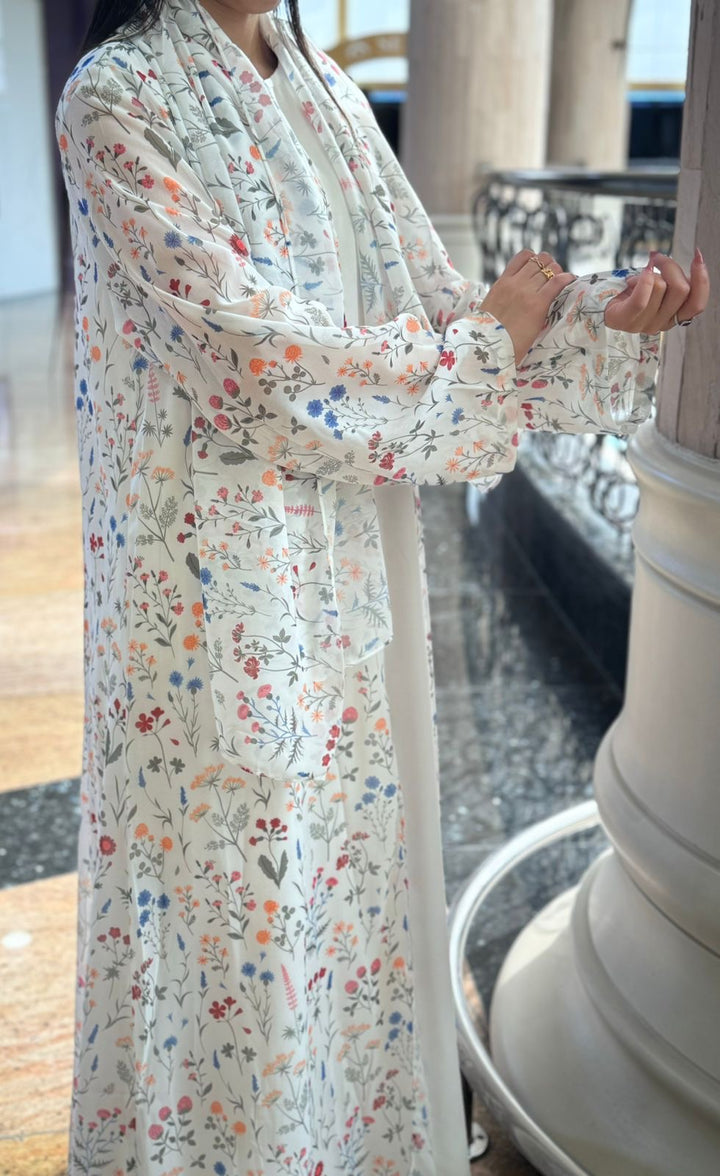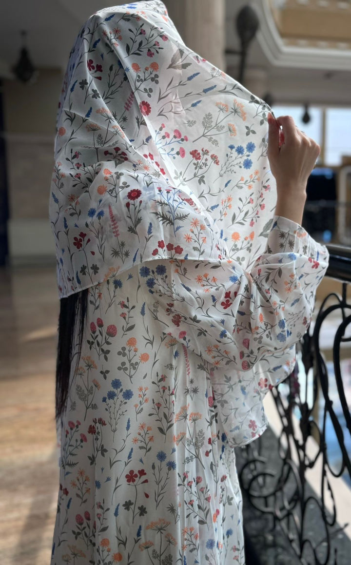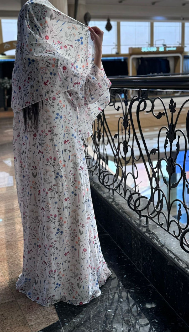 Step into timeless elegance with our mini Flower white Abaya, designed for women who value sophistication and grace. Crafted from luxurious lightweight fabric, this abaya features delicate embroidered white floral motifs that bring a touch of purity and refinement to your look.