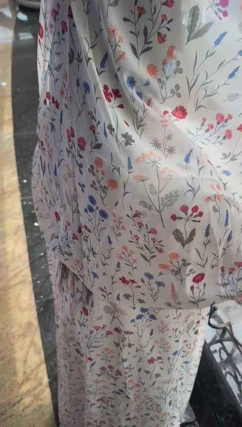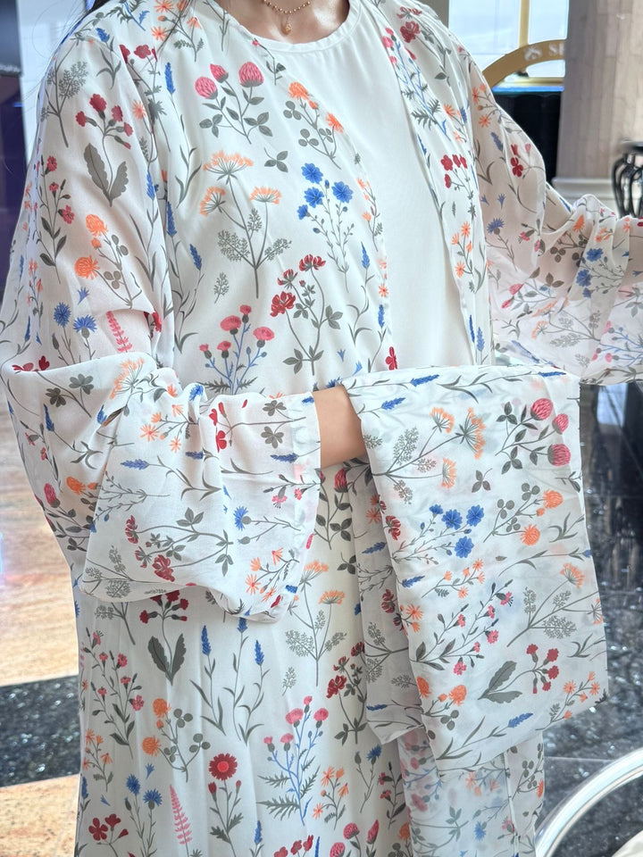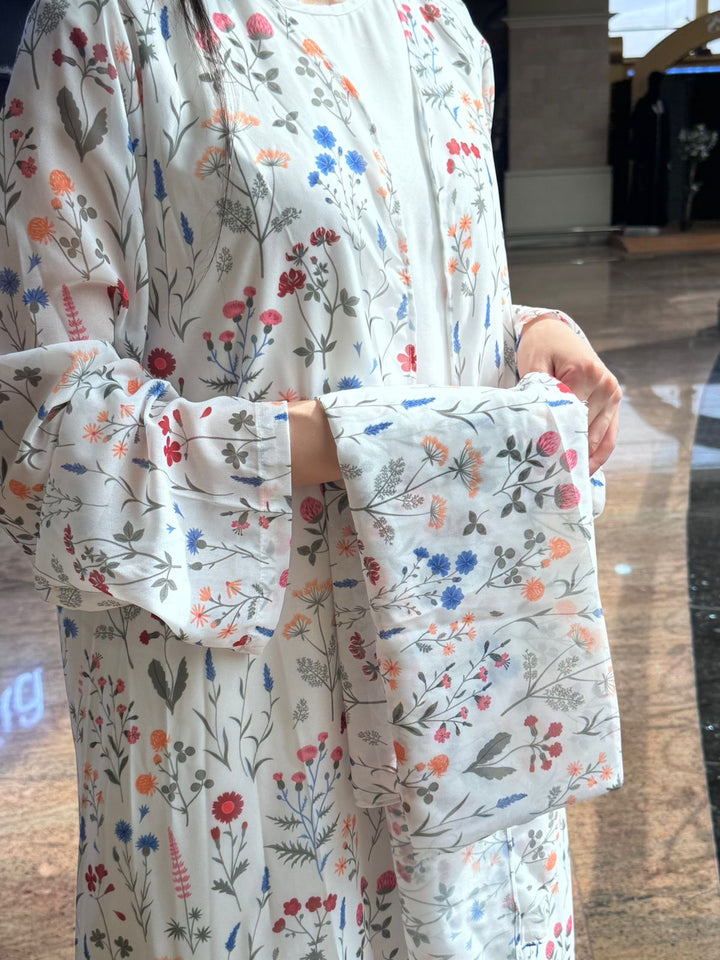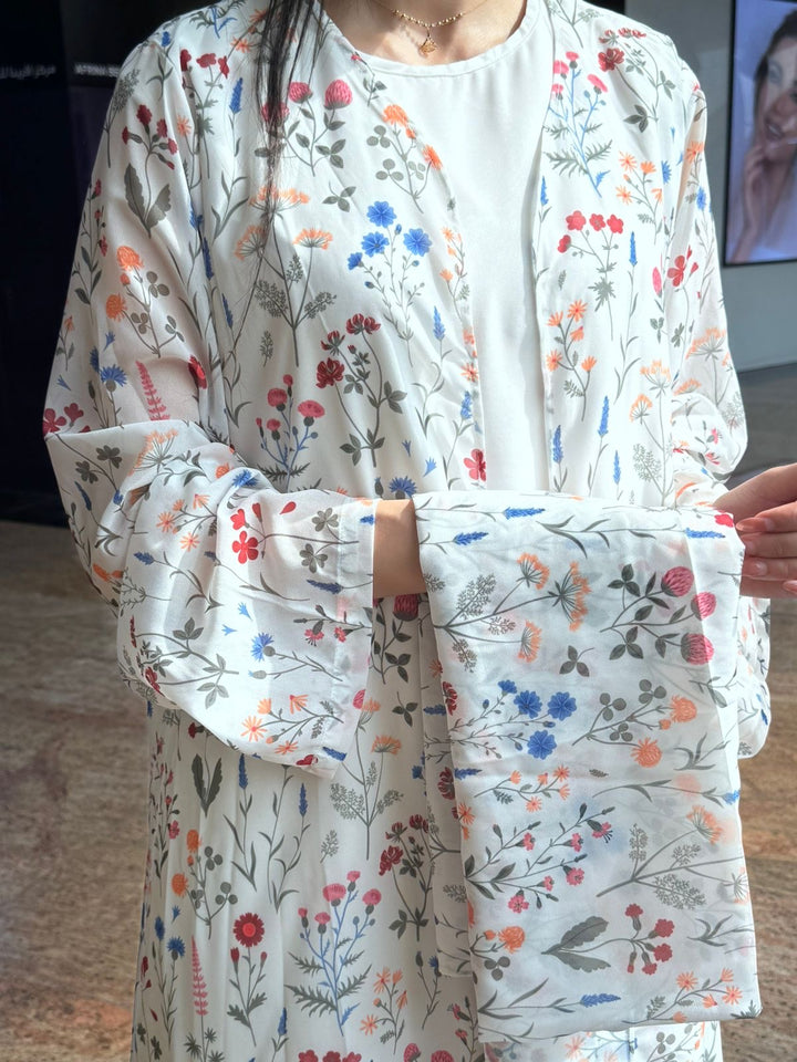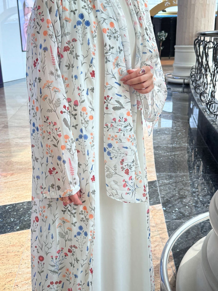 Step into timeless elegance with our mini Flower white Abaya, designed for women who value sophistication and grace. Crafted from luxurious lightweight fabric, this abaya features delicate embroidered white floral motifs that bring a touch of purity and refinement to your look.