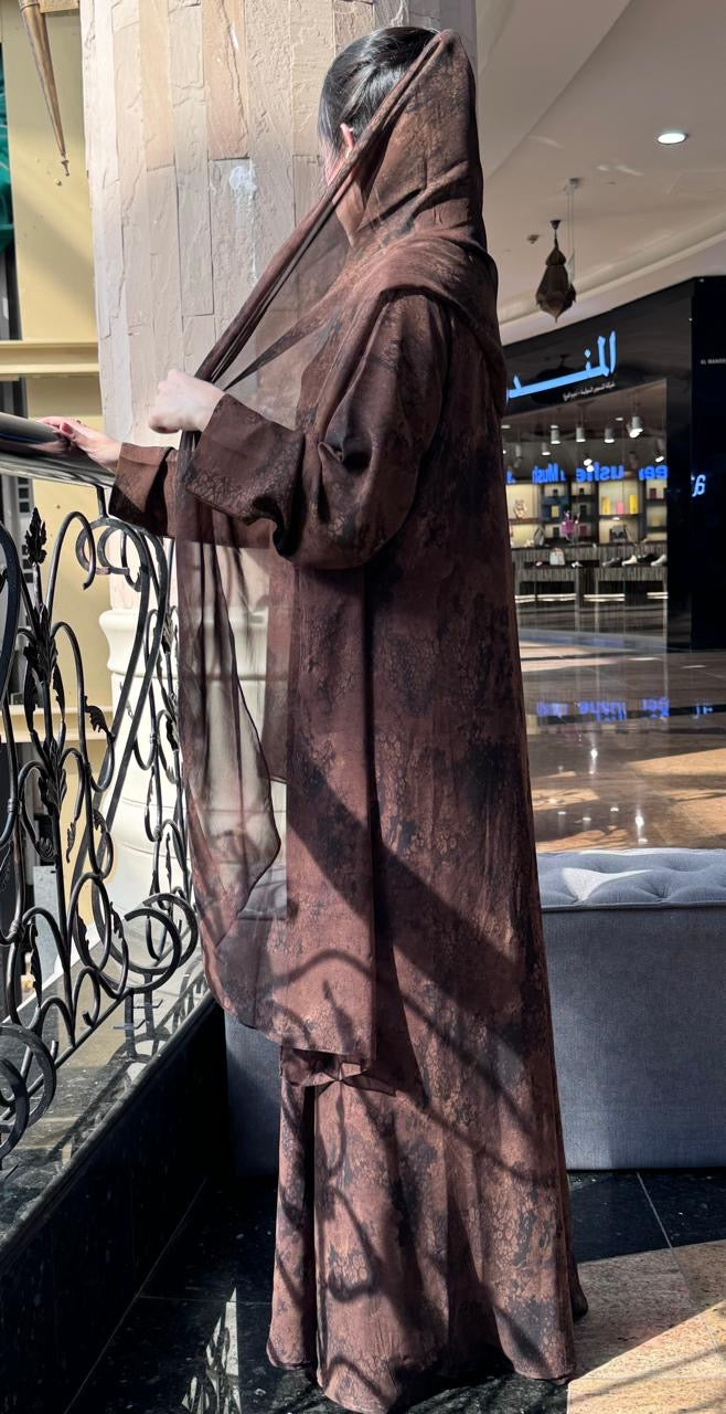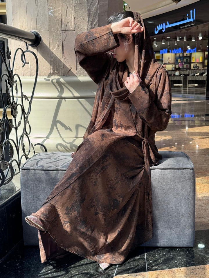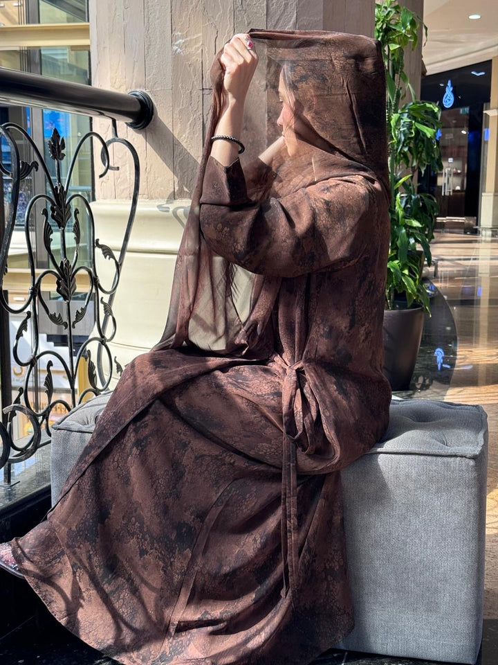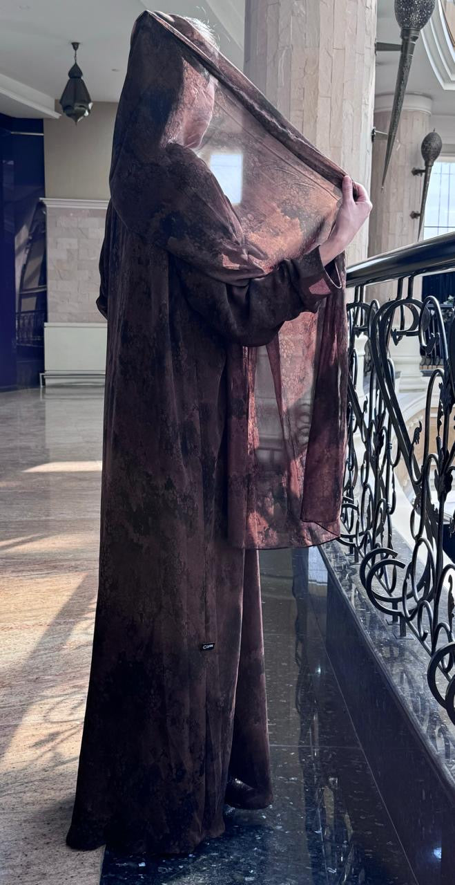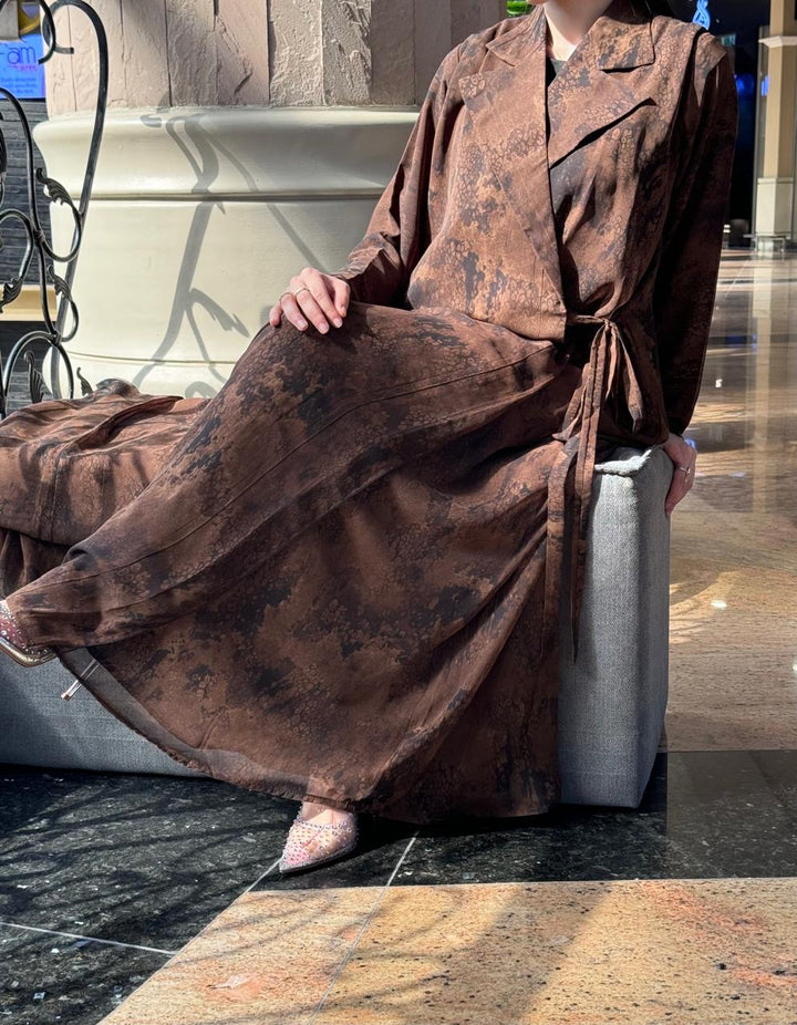 The Brown Chiffon robe will help you enter a realm of subdued elegance where luxury meets a mysterious forest hue. This lovely garment has a beautiful marbled design in rich