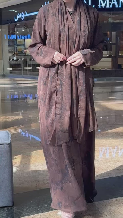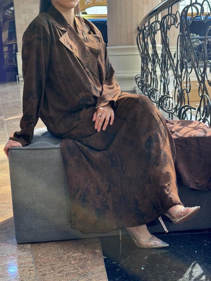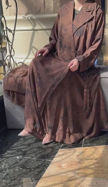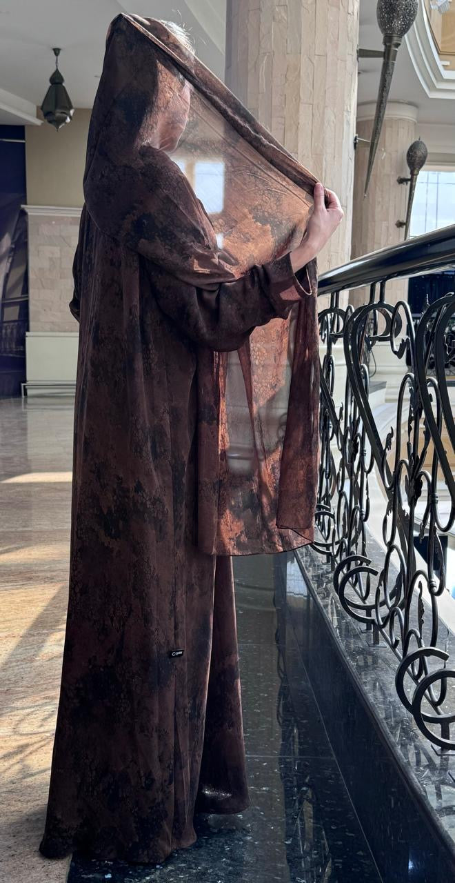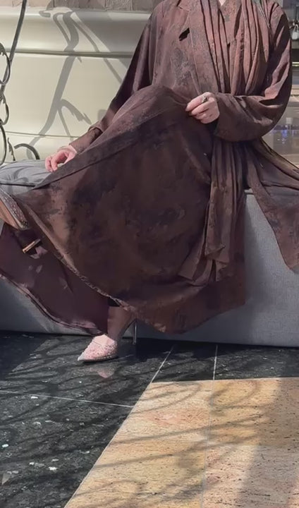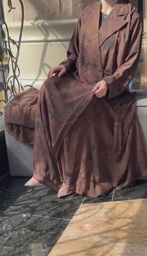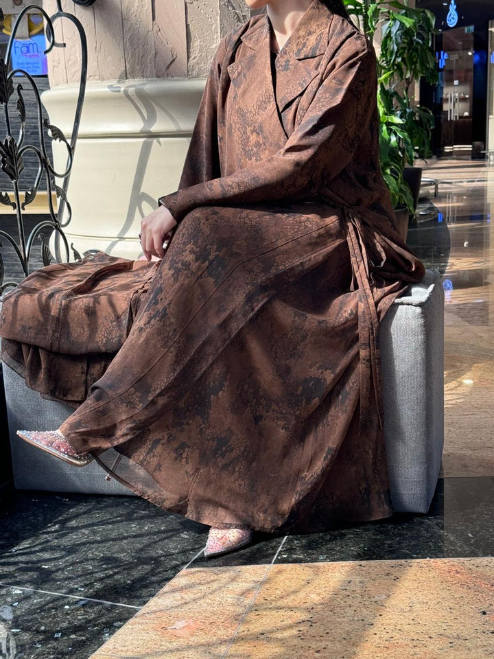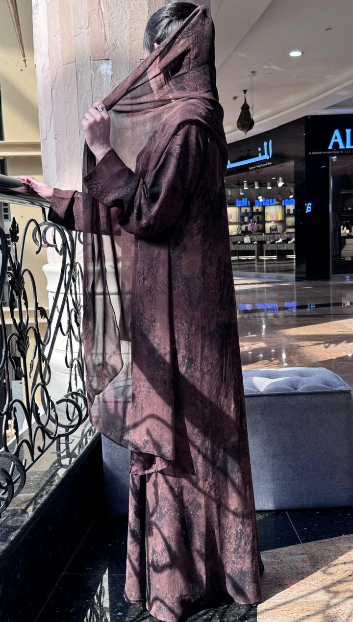 The Brown Chiffon robe will help you enter a realm of subdued elegance where luxury meets a mysterious forest hue. This lovely garment has a beautiful marbled design in rich