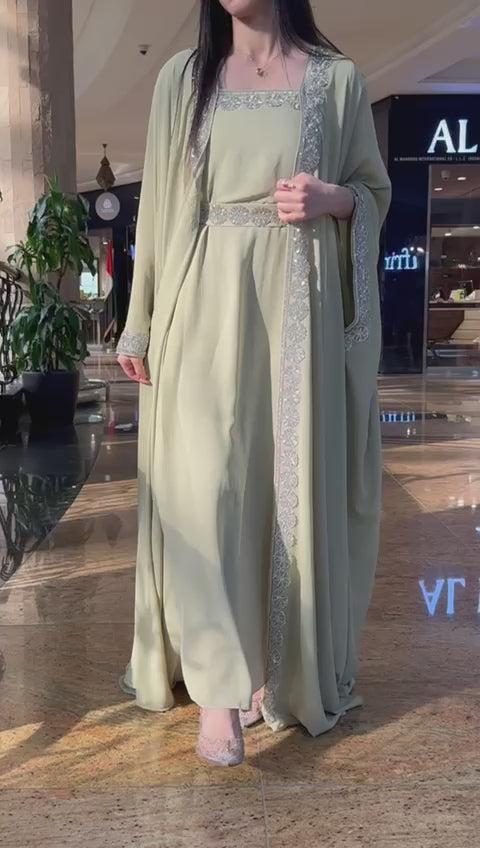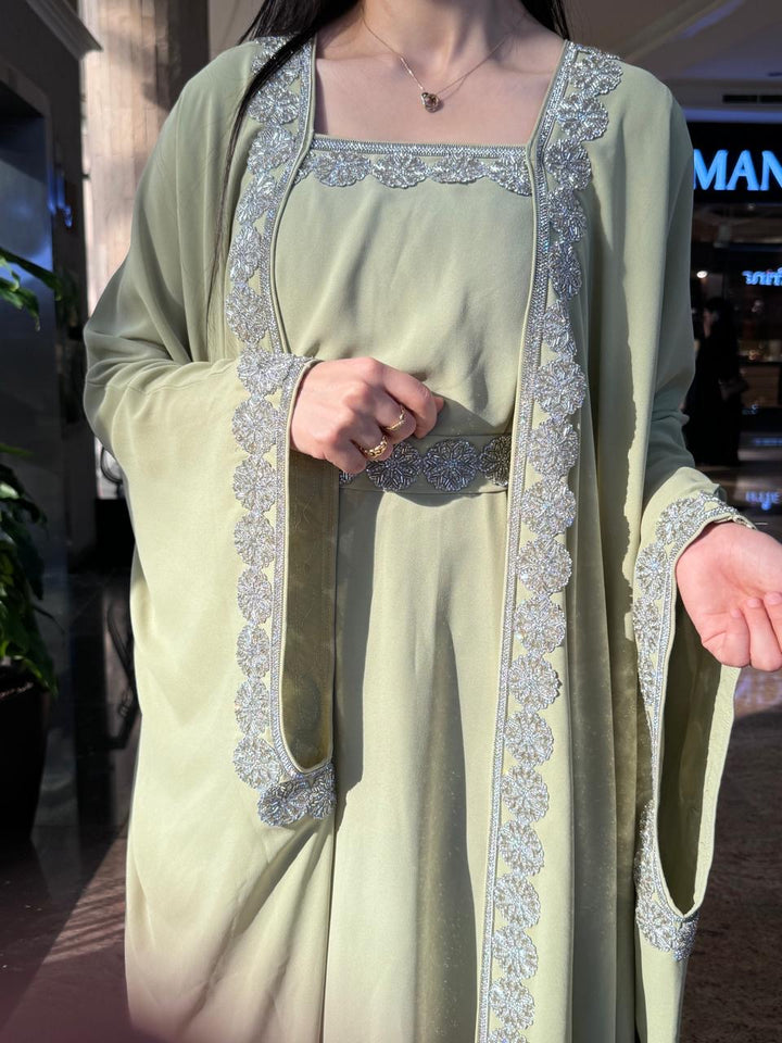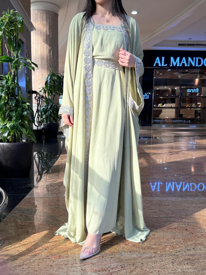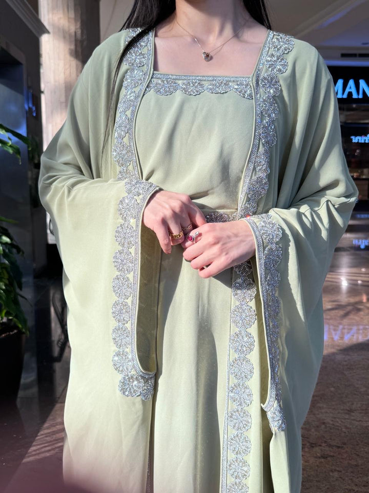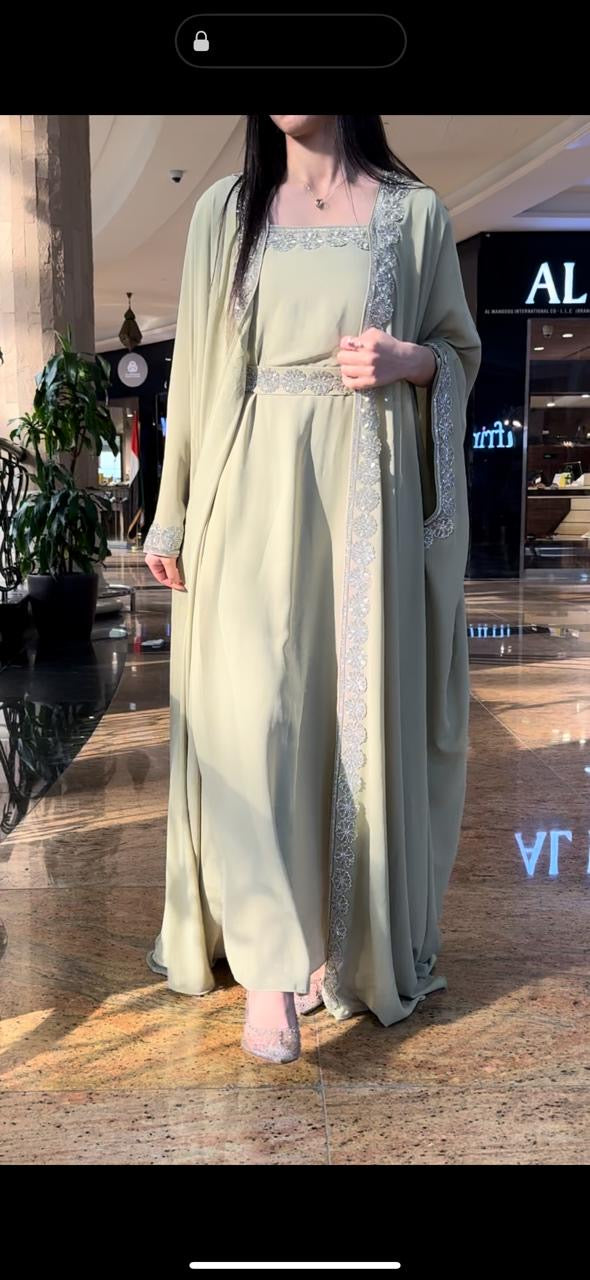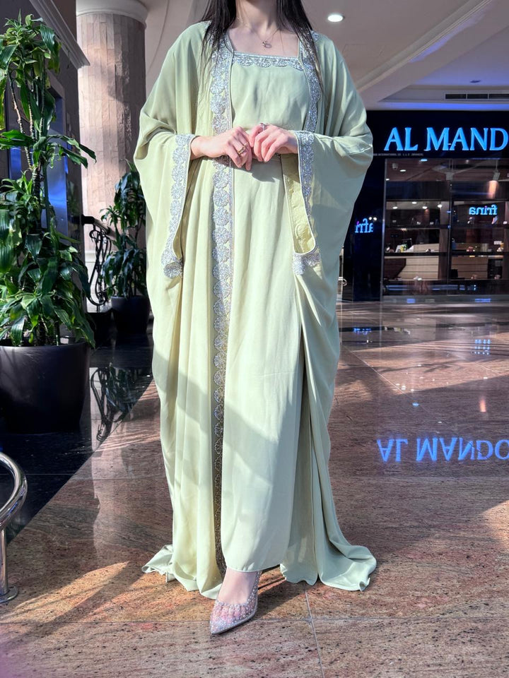 Step into timeless glamour with our Meera Green Kaftan, a stunning two-piece ensemble designed to captivate at every special occasion. From festive Eid celebrations and intimate Ramadan gatherings to weddings, henna nights, and elegant evenings, this kaftan is your statement of refined tradition.