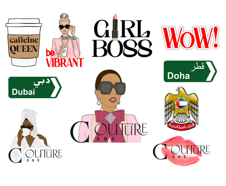 Inspired by the Couture 365 woman — elegant, ambitious, and always in style — each sticker features empowering phrases, feminine icons, and coffee-matcha tones that add personality and flair to your laptop, notebook, or tech accessories.
