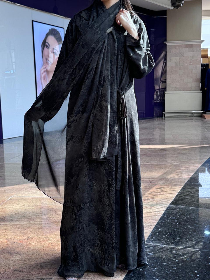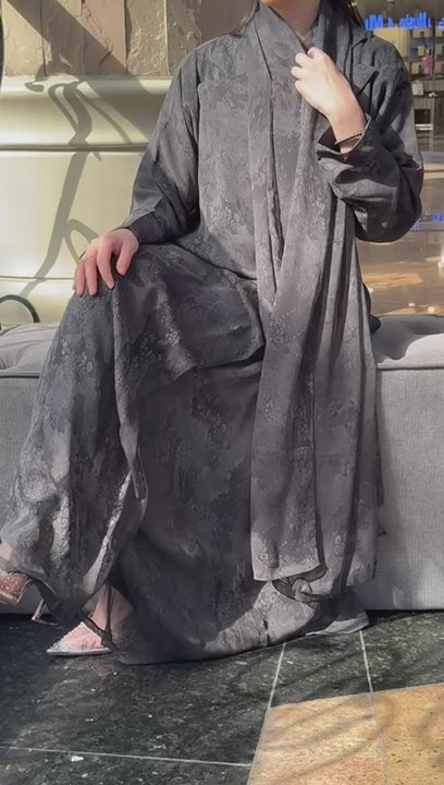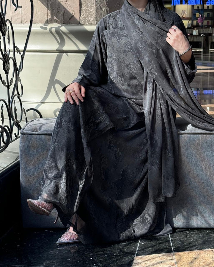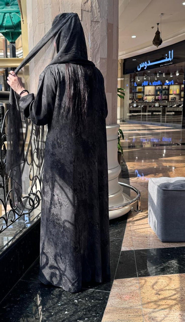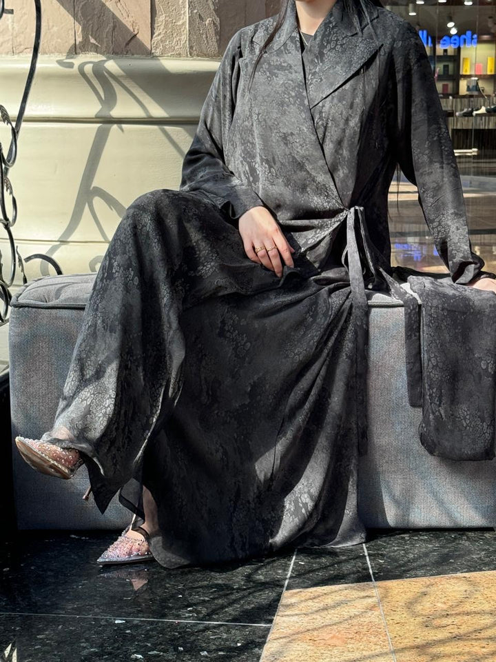 The Grey Chiffon robe will help you enter a realm of subdued elegance where luxury meets a mysterious forest hue. This lovely garment has a beautiful marbled design in rich